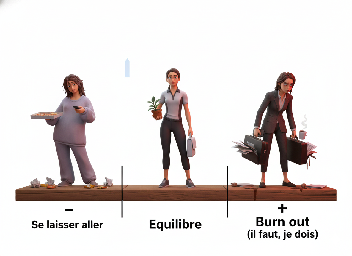 A l’opposé si le schéma exigences est trop présent, je vais générer beaucoup de stress avec des pensées d’obligations et de devoir. Pour calmer le stress des pensées, la mise en place de comportements à toujours vouloir faire plus, toujours faire mieux créant des dysfonctionnements avec des phénomènes de Burn out
