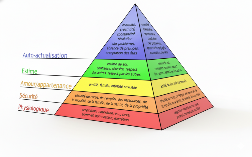 Les émotions nous mettent en mouvement. Elles nous permettent de trouver un équilibre et de nous protéger face à la violation de notre espace personnel et vital, de notre intégrité. Dans le cas contraire, nous risquerions de malmener nos besoins fondamentaux hiérarchisés selon Abraham Maslow (1916-1972) psychologue américain, définissant l’être humain comme un tout présentant des aspects physiologiques, psychologiques, sociologiques et spirituels.